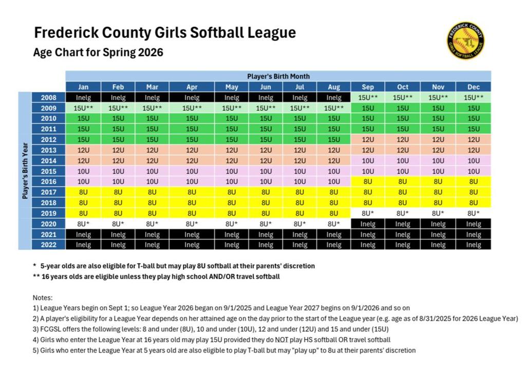 This fall FCGSL aligned age eligibility to USSSA age charts. Please find below a chart to show eligibility. It is now based on your age as of Sept 1 for a given school year. Girls are eligible to play the same age group for a full year - fall and the next spring.